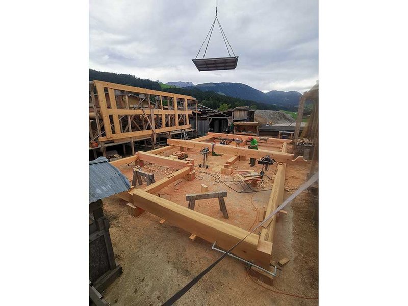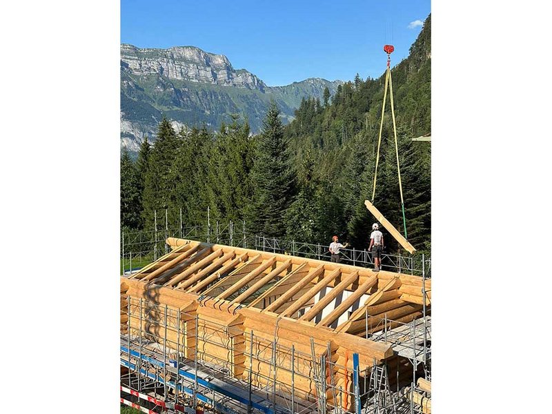 Im Februar 2023 hat man das Rundholz nach Gonten zur Brädäx GmbH transportiert und entrindet – mit Hochdruck, was nicht nur effizienter ist, als die Stämme von Hand zu schälen, sondern auch schonender für die Holzoberfläche. Danach wurde diese beim Abbund noch mit dem Zugmesser sauber geschält. Anschliessend ist jeder Stamm nummeriert und vermessen worden: Stock (Durchmesser unten am Stamm), Zopf (Durchmesser oben) und Länge. Dann folgte die Trocknungsphase, ehe im August 2023 mit dem Bau begonnen wurde.