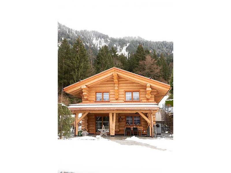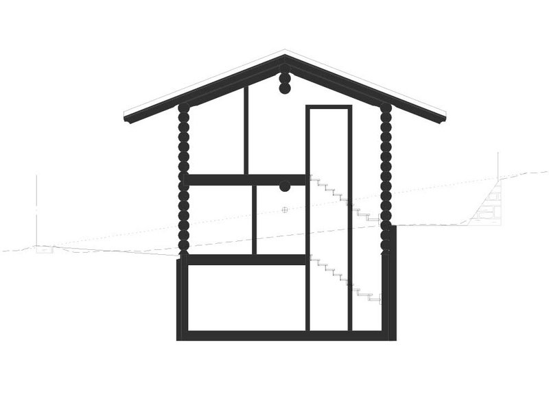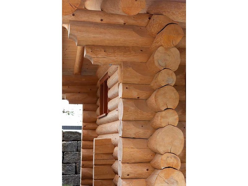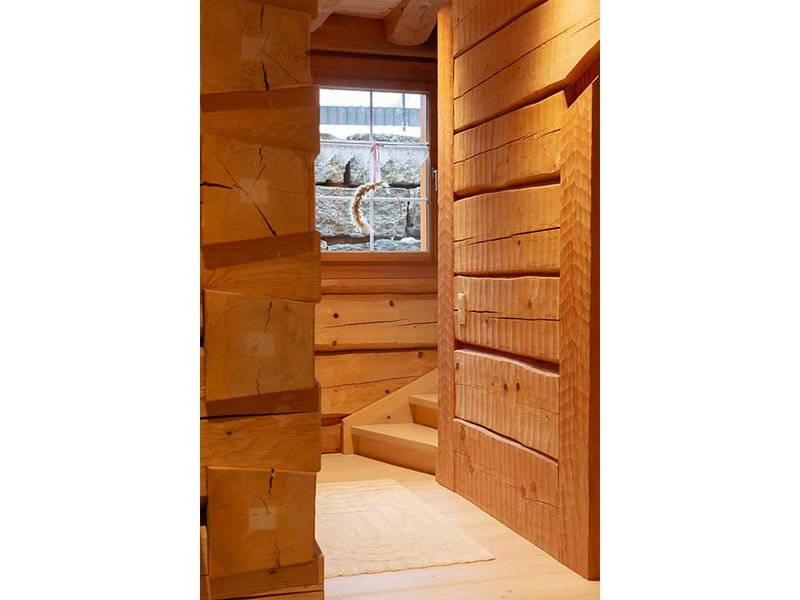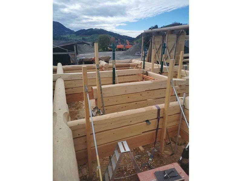 Die unterste Balkenlage besteht – im Gegensatz zu den Stämmen darüber – aus Douglasie des St. Galler Rheintals. Mit einem trapezförmigen Schnitt (das Splintholz wurde entfernt) erhält man als Basis gerade Flächen, was mitunter das Integrieren der Steckdosen erleichtert. Darüber erhebt sich eine Wand aus runden Naturstämmen (Weisstanne), die aufgrund von Längshohlfugen passgenau und deshalb stabil sowie luftdicht übereinanderliegen. Um die Auskehlung eines Stammes jeweils an die Unebenheiten des darunterliegenden Stammes anzupassen, wird die Form des unteren Holzes mit einem sogenannten Blockbauzirkel abgetastet und mit einem Stift auf das obere Holz übertragen. Die Innenwandstämme werden beidseits besäumt und nachher von Hand mit der Behauaxt bearbeitet.