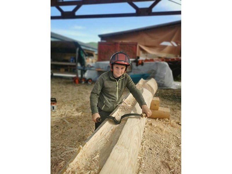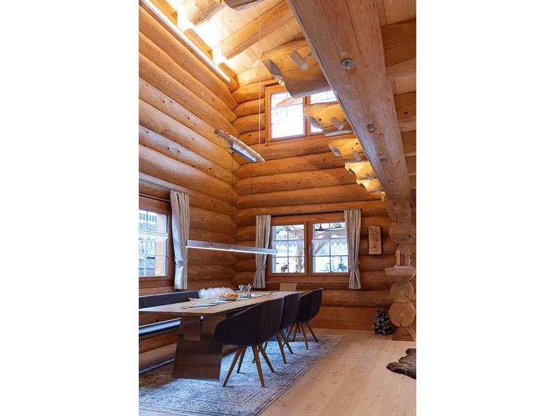 Bei den Blockhäusern von Michael Koller ist überall Natur spürbar, und fast alles ist irgendwie anders – anders als bei konventionellen Gebäuden. Das bestätigt sich nicht zuletzt beim Blick auf die Terrasse: Die mittlere der drei Stützen, die das Vordach tragen, besteht aus einem natürlich gewachsenen Zwiesel. Solche Astgabeln findet man allerdings nur selten, weshalb die anderen beiden Stützen aus gerade gewachsenen Stämmen gefertigt sind – jeweils ergänzt mit einem Kopfband zur Stabilisierung. Eines haben allerdings alle drei Stützen gemein: Sie stehen auf Stahlfüssen, die mit Schrauben höhenverstellbar sind. Ein wichtiges Detail, um auch die Stützen entsprechend absenken zu können, wenn sich das Gebäude setzt. Was einmal mehr zeigt: Die Planung und Fertigung eines Blockbaus ist in jeglicher Hinsicht eine komplexe Sache und hat so seine Eigenheiten. Und so wundert es nicht, dass es bei einem Blockbau jede Menge Erfahrung braucht. Wobei sich schon die Kleinsten früh darin üben: «Jedes Kind baut aus Holzklötzen instinktiv einen Blockbau», erklärt Michael Koller schmunzelnd.