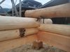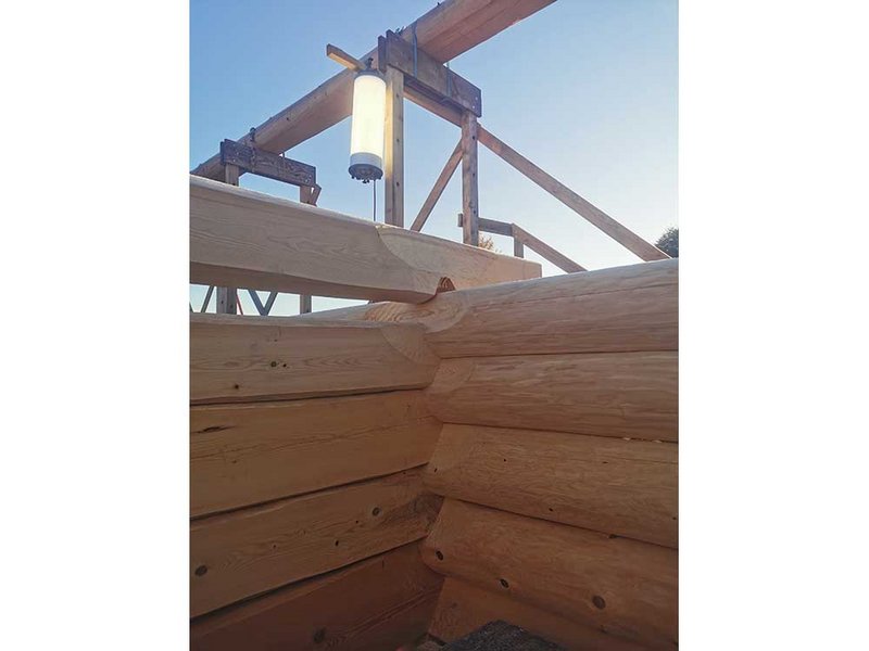Weil ein Stamm im Laufe der Zeit reissen kann, wird auf der Oberseite ein Entlastungsschnitt gemacht – eine Art Sollbruch-stelle, die später nicht sichtbar ist. An den Ecken – also dort, wo die Hölzer kreuzweise übereinanderliegen – fügen sich die Stämme ebenfalls durch passgenaue Auskervungen (sogenannte Sattelkerven) zusammen und bilden durch die Verzahnung eine stabile, kraftschlüssige Verbindung. Abgedichtet werden die Holzlagen mit Dichtungsbändern und Schafwolle.