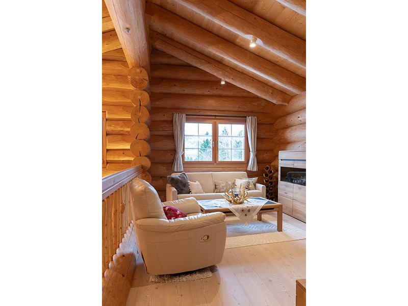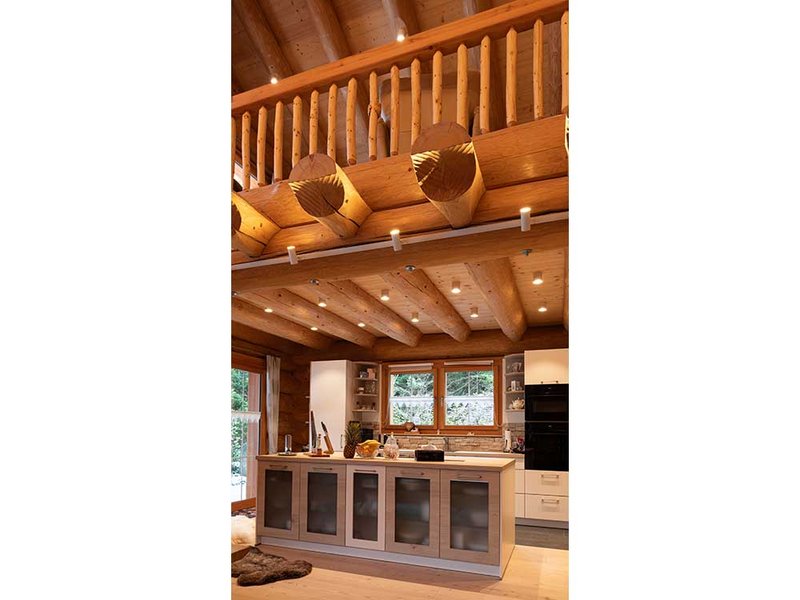 Dass der Altersruhesitz des Paares ein Blockbau werden sollte, stand von Anfang an fest. «Es war schon immer mein Traum, in einem solchen Holzhaus zu wohnen», erklärt der Bauherr. Und weil dieser inzwischen in seiner Mobilität eingeschränkt ist, sollte das Eigenheim behindertengerecht konzipiert und gebaut sein. Ein Wunsch, den die Brädäx GmbH – der Betrieb übernahm die komplette Planung – durch entsprechende Massnahmen erfüllen konnte. So gelangt man von der Garage im Untergeschoss über einen Lift schwellenlos zu den beiden darüberliegenden Geschossen. Das Erdgeschoss umfasst hierbei eine offene Küche mit Essbereich, eine Waschküche und zwei kleine Abstellräume; auf dem Obergeschoss befindet sich eine Galerie mit Wohnbereich, ein Schlafzimmer sowie ein Bad.