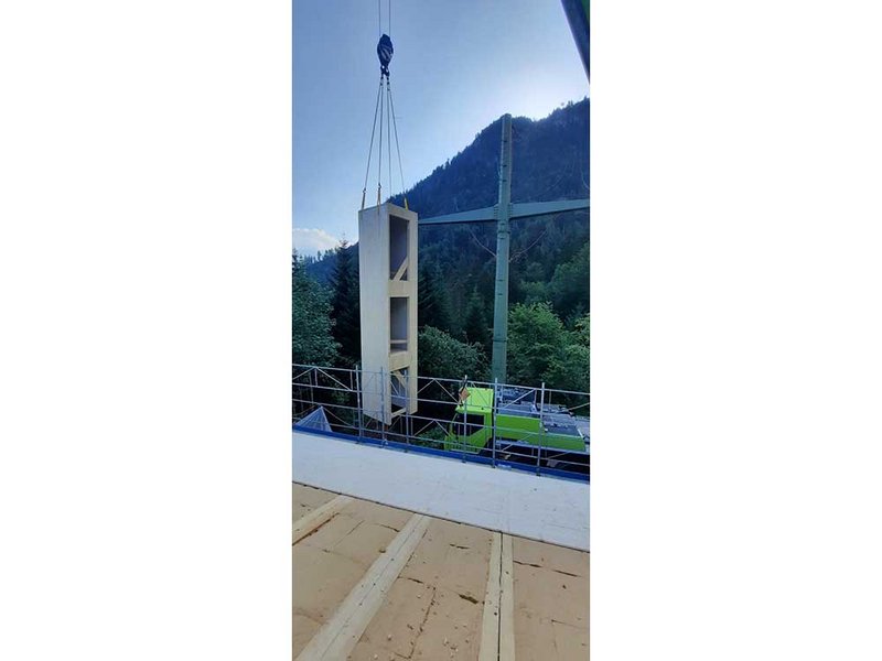 Nicht minder herausfordernd war bei diesem Projekt der Einbau des Liftschachts, der aus Dreischichtplatten (ebenfalls Schweizer Holz) besteht. Dieser wurde erst am Schluss – als das Haus bereits aufgerichtet und die Treppen eingebaut waren – mit dem Kran von oben eingefädelt. Zuvor mussten aber nochmals zwei der Dachsparren herausgenommen werden. Das Ergebnis begeistert Michael Koller noch heute: «Mithilfe des Tachymeters konnten wir alles millimetergenau platzieren und alles hat auf Anhieb perfekt gepasst.» Wobei der Zimmermann betont, dass es ihm zwar wichtig sei, traditionelles Handwerk zu zeigen, er aber gleichzeitig auch auf moderne Technologien setze. «Ich will nicht Ballenberg spielen», bringt er es salopp auf den Punkt.