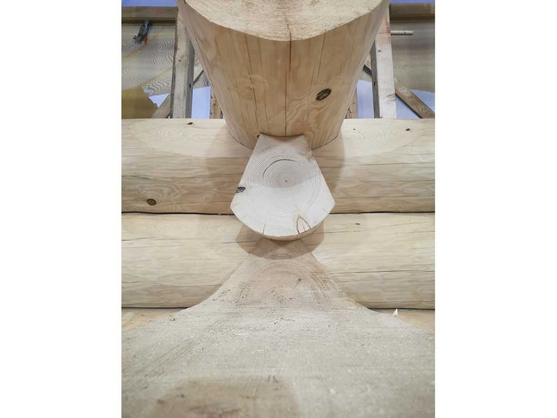 Speziell bei den Blockbauten von Michael Koller ist, dass sich die Blockbauweise konsequent bis unters Dach fortsetzt, was sonst oft vermieden wird. Der Grund: Der Bau setzt sich noch stärker und verändert auch die Dachneigung. «Wenn das passiert, gibt es enorme Schübe auf die Fusspfetten. Dem muss man Rechnung tragen: Die Sparren sind angespitzt und können so in die liegenden Fusspfettenstämme reinrutschen. Ansonsten drückt es die Wand nach aussen», erklärt Michael Koller und fügt hinzu: «Das so hinzubekommen, dass alles sauber funktioniert, ist eine echte Herausforderung!»