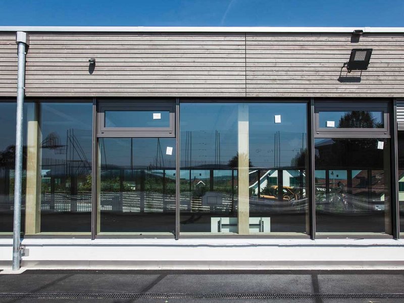 Im Interesse einer nachhaltigen Waldnutzung sind die primären tragenden Bauteile der ganzen Halle in BauBuche konstruiert. Dies gilt auch für die Unterkonstruktion der grosszügigen Verglasung, welche entsprechend feingliedrig in Erscheinung tritt. Im Gegensatz zu herkömmlichen Nadelholzkonstruktionen ermöglicht die BauBuche wegen ihrer aussergewöhnlich hohen Festigkeit und Steifigkeit wesentlich schlankere Bauteile. Beim Material BauBuche handelt es sich um ein Furnierschichtholz, bei dem Schälfurniere kreuzweise verleimt werden. Dies gibt dem Konstruktionsholz eine erhöhte Masshaltigkeit und Stabilität. Dank diesen Eigenschaften konnte bei der Konstruktionshöhe des Hallendaches eingespart und die Gebäudehöhe möglichst tief gehalten werden. langenegger-architekten.ch, vogelsang-holzbau.ch
