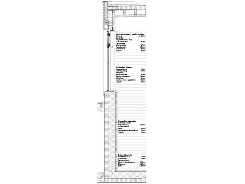 Das leicht geneigte Hallendach ist im Bereich des Nebentragwerkes mit 80 mm Glaswolle gedämmt. Darüber ist die begrünte Flachdachkonstruktion mit 140 mm PUR-Dämmung ausgedämmt. Für den Bodenbelag wurde ein PUR-Turnhallenboden auf Gussasphalt gewählt. Der darunterliegende Betonboden ist mit einer Fussbodenheizung ausgestattet. Die Wände sind in Holzständerbauweise errichtet und mit Steinwolle (160 mm) isoliert. Die Hallenkonstruktion erreicht einen U-Wert von 0,155 W/m2K.