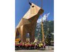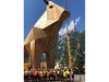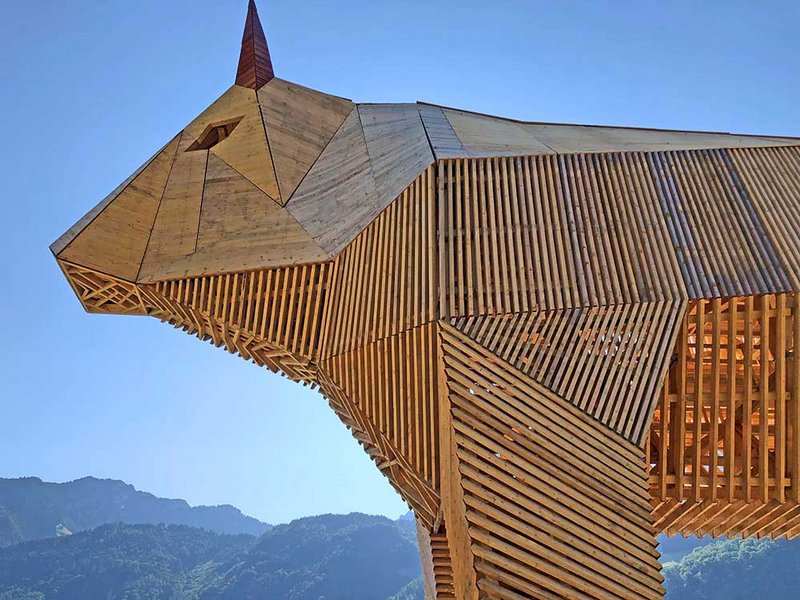 Muni Max ist zu 100 Prozent aus Schweizer Holz regionaler Wälder gebaut, mehrheitlich aus Fichte. Lediglich die Hörner sind aus dem Holz eines Birnbaums gefertigt, welcher auf dem ESAF-Gelände gefällt werden musste. «Der hölzerne Stier besteht aus 437 vorgefertigten Elementen beziehungsweise 4502 einzelnen Bauteilen. Die grössten davon sind die beiden Fachwerkträger für das Haupttragwerk mit einer Länge von 20,5 Metern», weiss auf der Baustelle Roland Abderhalden, Geschäftsführer der Cadwork Holz AG aus Herisau (AR), zu berichten. Abderhalden ist einer von rund 60 Helfern aus etwa 30 Holzbauunternehmen, die im Zwei-Schicht-Betrieb bei der Aufrichte von Muni Max in Fronarbeit mitgeholfen haben. Insgesamt waren rund 800 Personen am Projekt beteiligt.