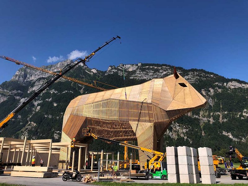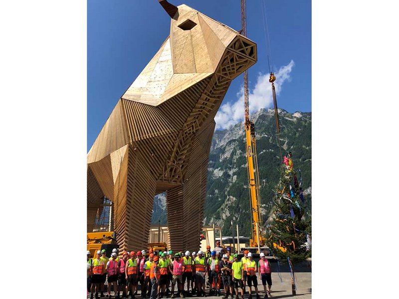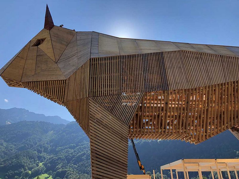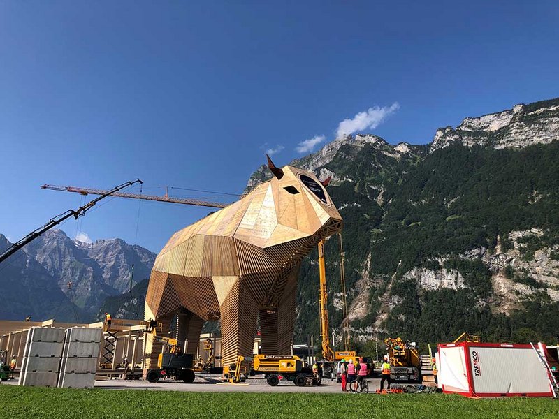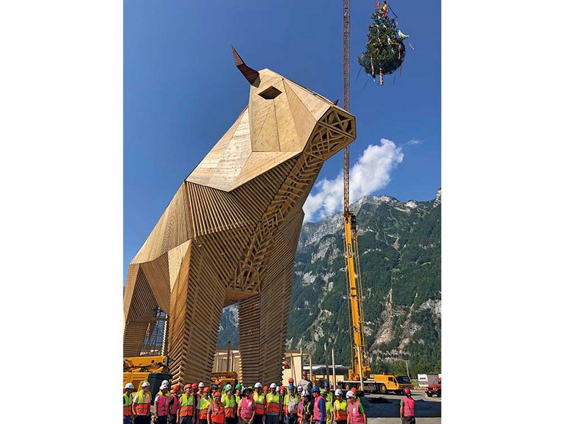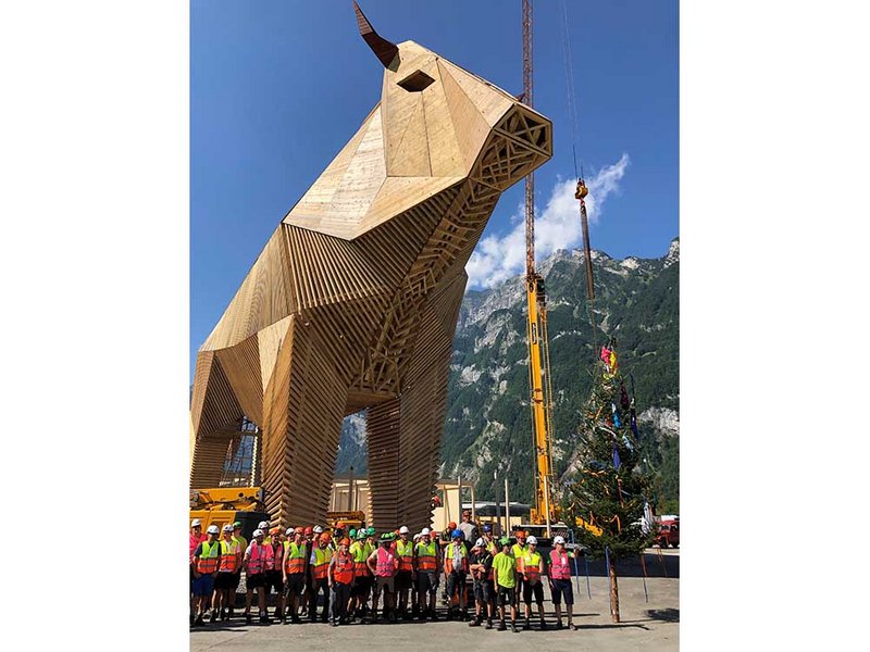 «Die grössten Einzelteile sind in den Beinen des Stiers verbaut: Leimholzbinder mit Abmessungen von 1,3 Meter auf 2,4 Meter und einer Länge von 15 Metern», so Abderhalden. Er dokumentierte den Prozess der Aufrichte digital, um für Kooperationen bei künftigen Grossprojekten gut vorbereitet zu sein. Den Überblick im Projekt hatten Gesamtprojektleiter Martin Antemann sowie die Montageleiter Paul Engler und Marcel Oertig. Die Stunden, die sie investiert haben, bleiben ungezählt. Auch Initiant Stefan Müller hat unendlich viel Zeit mit diesem einzigartigen Projekt verbracht: «Bei 1300 Stunden habe ich aufgehört zu zählen», schmunzelt er.
