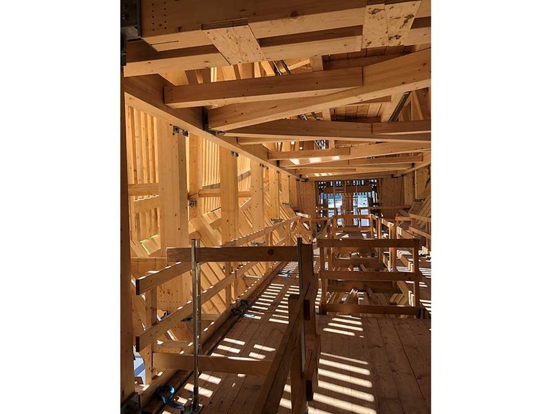 «Es ist eindrucksvoll, was durch gemeinsame Werte und Zusammenarbeit entstehen kann», zeigte sich Stefan Müller beim Richtfest Anfang August sichtlich emotional. «Muni Max ist das erste Bauwerk, das gemeinsam von allen Akteuren entlang der Wertschöpfungskette Holz realisiert wurde – von Wald und Forst über Sägereien, Handel und Transport bis hin zu Produktion, Verarbeitung und Bau.» Mehr als 220 Unternehmen und Institutionen haben dies möglich gemacht. Ausserdem waren über 500 Lernende aktiv beteiligt, denn nicht nur in den Betrieben, auch in den üK-Zentren wurden einzelne Elemente vorgefertigt. Aus dem Restholz, das bei der Produktion abfiel, ist durch die Schreiner der Ostschweizer Holzkette der Innenausbau für den Gabentempel und die Schwingerbar errichtet worden. Auszubildende der ibW Höhere Fachschule Südostschweiz hatten das Konzept dazu erstellt.