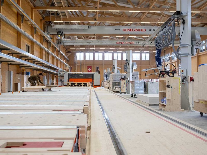 Die Produktionshalle erhielt ein Dach mit Koppelpfetten und Sandwichplatten, das sowohl Witterungsschutz als auch eine effiziente Dämmung bietet. Die Neigungen von 10 und 60 Grad sind nicht nur optimal für die Entwässerung, sondern verleihen dem Gebäude auch eine dynamische Optik. Das Herzstück in der Halle ist die 100 Meter lange Produktionsanlage mit CNC-Technologie. Zudem hat das Unternehmen gemeinsam mit der Technowood AG und der Isofloc AG ein vollautomatisches Dämmlager und ein Dämmportal entwickelt. Mit diesen Anlagen können noch mehr Arbeiten von der Baustelle ins Werk geholt werden, was Kosten- und Terminsicherheit bringt.
