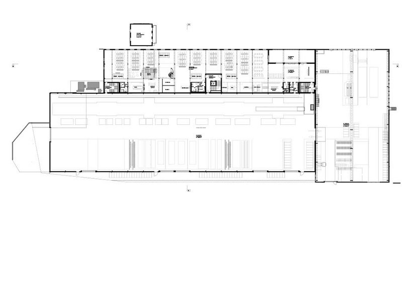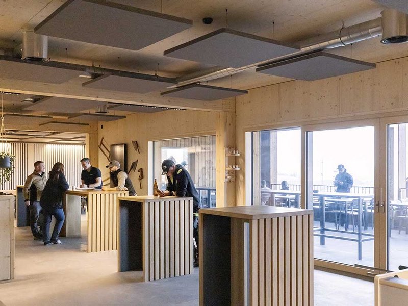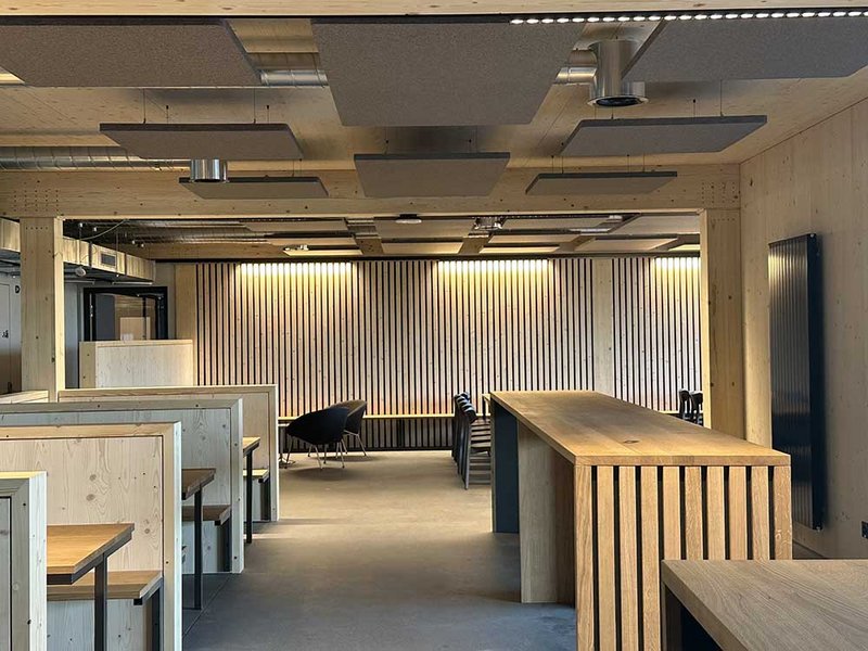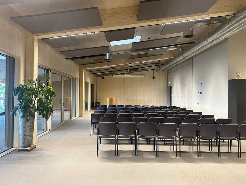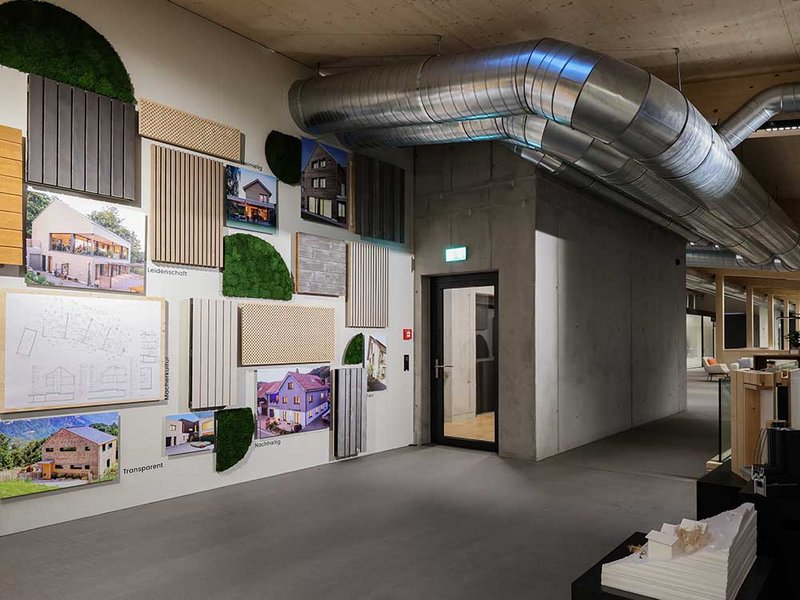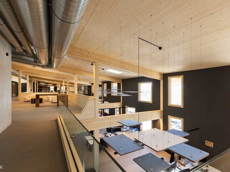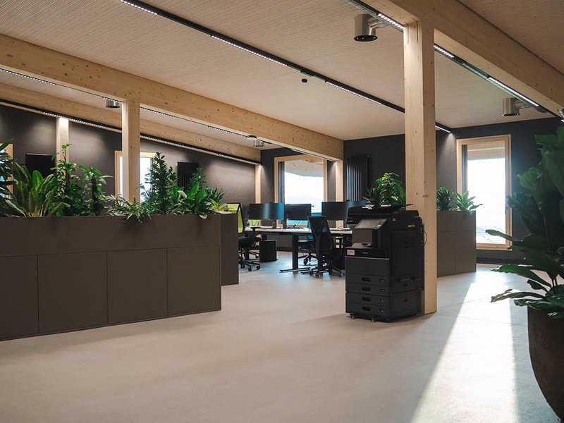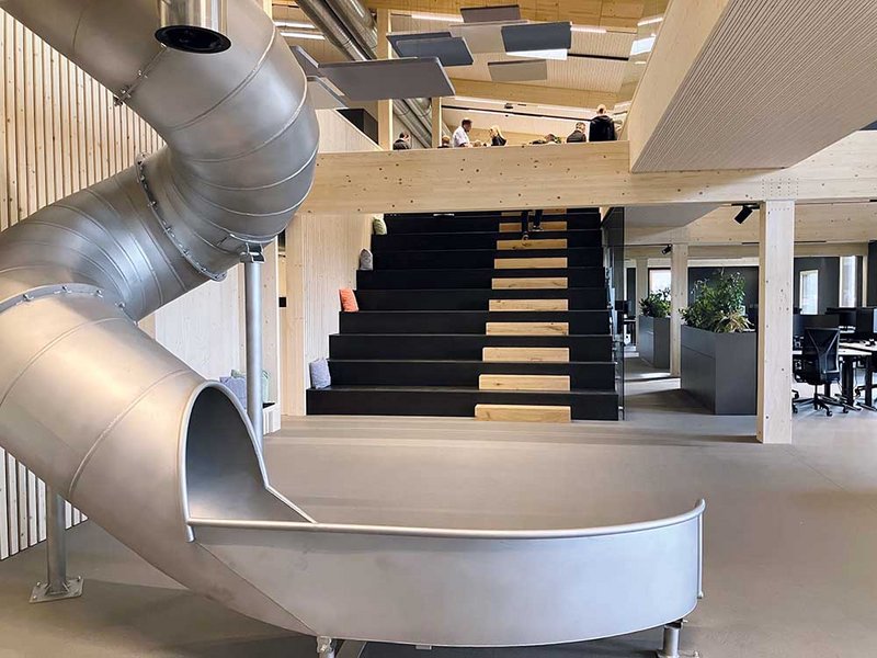 An die Produktionshalle mit stolzen Abmessungen von rund 107 auf 33 Metern lehnt sich der Bürotrakt. Diesen betreten die Mitarbeitenden durch das Untergeschoss, in dem sich fremdvermietete Büro- und Lagerräume befinden. Im Erd- und im Obergeschoss sind die grossräumigen Bürolandschaften mit Empfang, Sitzungsräumen und Pausenort eingerichtet. Die drei Treppenhäuser erfüllen zum einen die Vorschriften zur Entfluchtung und übernehmen eine wichtige Rolle im statischen Konzept. Zum anderen ermöglichen sie einen getrennten Zugang für Mitarbeitende und Besuchende. Besonders ins Auge fällt die Fensteranordnung, die einen Kontrast zur ruhigen, vertikalen Holzverkleidung darstellt. In Kombination mit den Dachfenstern entsteht im Inneren des Gebäudes eine Lichtstimmung, die das Wohlbefinden der Mitarbeitenden fördert und so zu einer höheren Qualität der Arbeit beitragen soll. Für das Innenausbaukonzept konnten die Mitarbeitenden ihre Ideen und Anregungen einbringen. Diese wurden in den Planungsprozess integriert, sodass die Räumlichkeiten optimal auf Prozessabläufe und die Bedürfnisse der Nutzer abgestimmt sind. Das Highlight im Büro ist sicher die Rutsche, die für eine Abkürzung vom Ober- ins Erdgeschoss einlädt. Der Skelettbau aus Holz ermöglicht flexible Grundrisse und eine offene Raumwirkung. Sichtbare Holzoberflächen schaffen eine warme, einladende Atmosphäre. Die Aussenwände bestehen aus gestrichenen OSB-Platten, während Einbauten mit gespachtelten MDF-Platten und die Trennwände zur Produktionshalle mit Fermacell verkleidet sind. Die Zellulosedämmung in den Wänden schluckt zudem den Schall. Im Bürotrakt sorgen Akustikplatten im Erdgeschoss und Akustikdeckensegel im Dachgeschoss für eine angenehme Geräuschkulisse. Für die Böden fiel die Wahl auf einen eingefärbten Anhydritboden.