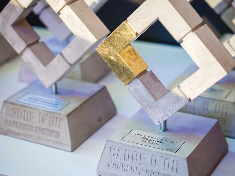 Enrico Uffer gewinnt den Cadre d’Or 2017 in der Kategorie HolzBau. Der Unternehmer aus Graubünden wird damit von Baukader Schweiz für sein innovatives Modulsystem Quadrin geehrt. Über den Preis in Silber freuen sich die Holzforscher Tanja Zimmermann und Ingo Burgert von der Empa. Ausgezeichnet wird auch Christian Kündig, Leiter Holzbau bei Implenia. In der Kategorie BauAusbildner wird das Engagement von Richard Frischknecht, Leiter des Ausbildungszentrums Holzbau Zürich, mit dem zweiten Rang honoriert.