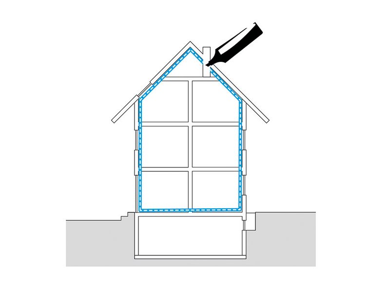 Die SIA 180 empfiehlt nicht nur im Bereich der Gebäudehülle, sondern auch zwischen gewerblichen Nutzungszonen oder Wohnungen, Anforderungen an die Luftdichtheit zu definieren. Sind diese Festlegungen erfolgt, können der Dämmperimeter und die Luftdichtheitsebene festgelegt und in den Plänen markiert werden. Dämmung und Luftdichtung sollten, wie in der Abbildung 1 dargestellt, lückenlos und umlaufend geführt werden. Problematisch ist bei der Luftdichtung oft ein Wechsel der Ebene. Bei einer Aufdachdämmung etwa läuft die Luftdichtungsebene, wie in Abbildung 2 verdeutlicht, in der Dachschräge aussen auf der Sichtschalung. Diese soll mit dem nächsten luftdichten Bauteil, dem Innenputz der Aussenwand, verbunden werden. Das hat sich in der Praxis als schwierig auszuführendes Detail erwiesen.