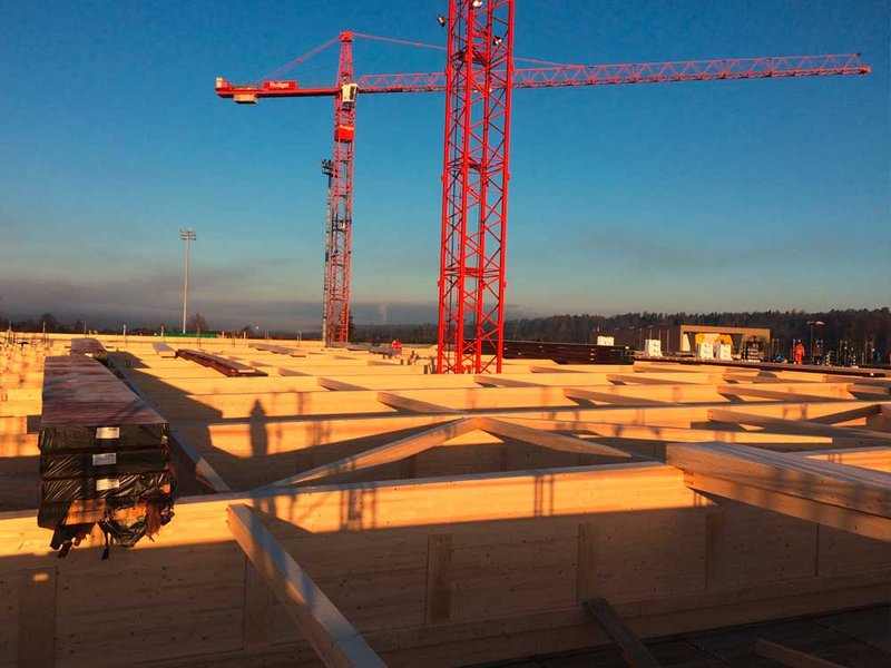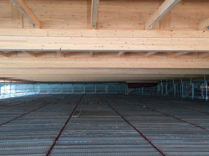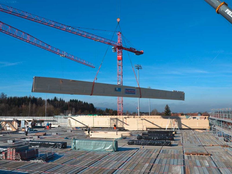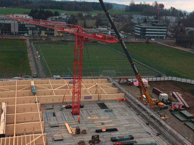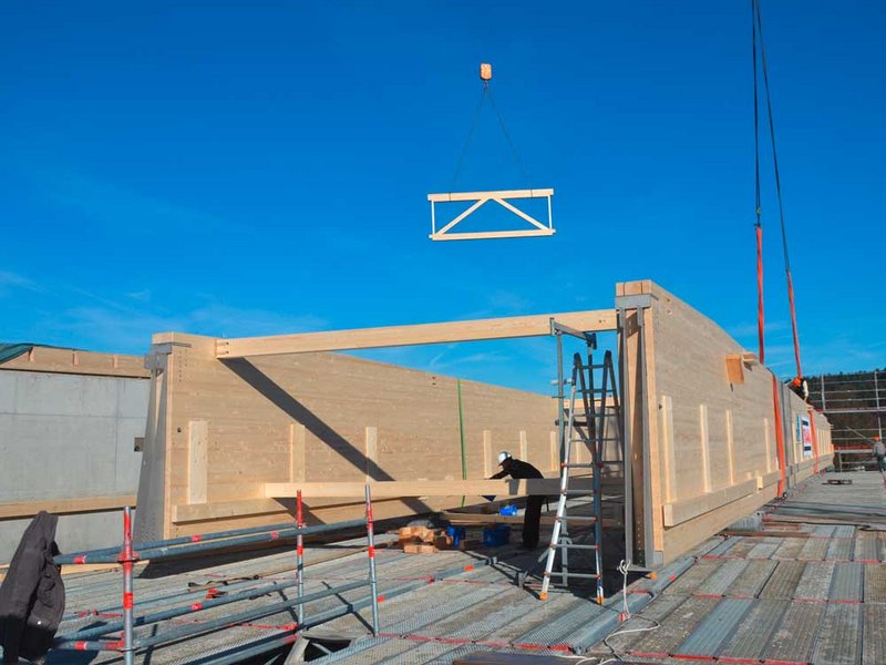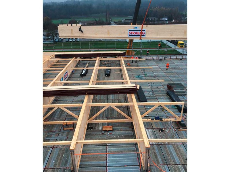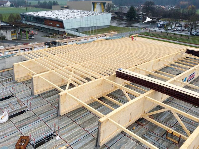 In den rund acht Monaten von Auftragseingang bis Baubeginn waren bei Strabag Holzbau zeitweise drei Mitarbeiter mit der Werkplanung, Ausführungsstatik und Arbeitsvorbereitung befasst. Drei weitere Mitarbeiter waren ausserdem rund zwei Wochen mit dem Einmessen und der Vormontage der Stahlbauteile beschäftigt. Die Aufrichte des Haupttragwerks mit zwanzig Holzbindern (2,80 respektive 2,72 auf 0,36 Meter) erfolgte dann in nur einer Woche durch sechs Zimmerleute. Für die Montage wurde vorgängig ein vollflächiges Arbeitsgerüst erstellt, was ein sicheres Arbeiten ermöglichte. Neben dem Primär- und Sekundärtragwerk in Holz wurden auch die Flachdachelemente, die Aussenwände, der Technikanbau, der Anbau für die Anlieferung und die Brandschutzverkleidungen durch Strabag Holzbau montiert. Hierfür waren weitere vier Mitarbeiter während drei Monaten im Einsatz, die 156 m3 OSB-3-Platten, gut 800 m3 Brettschichtholz, knapp 180 m3 Konstruktionsholz sowie 6?m3 Sperrholzplatten, 3?m3 Furnierschichtholz und 2 m3 Brettsperrholz für das Hallenbad verbauten. Allein für die Anlieferung der Hauptträger waren zehn Spezialtransporte erforderlich.