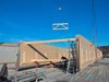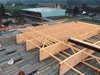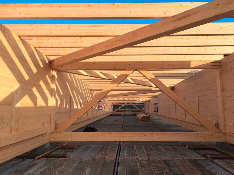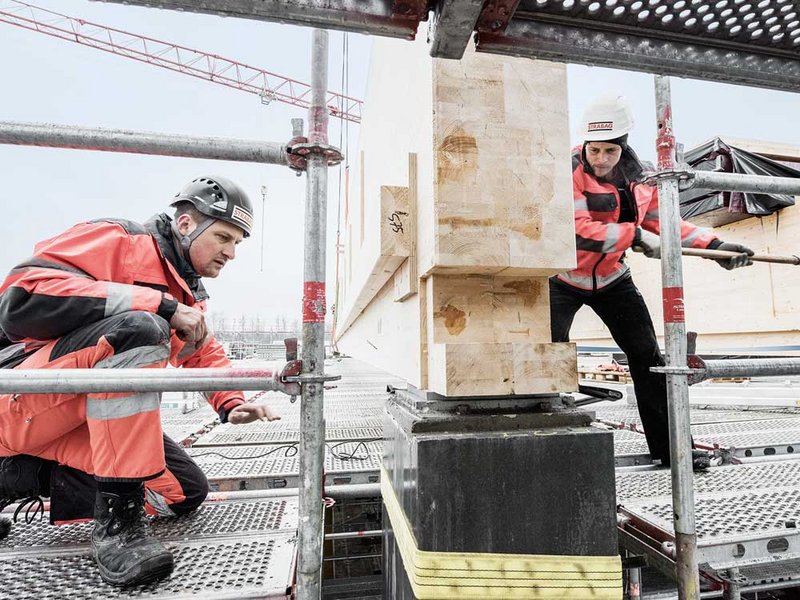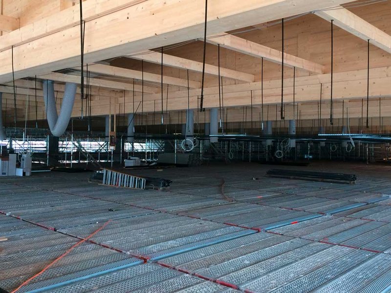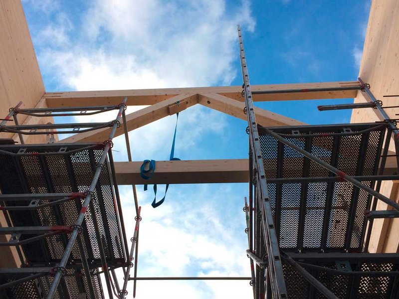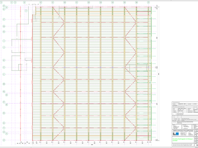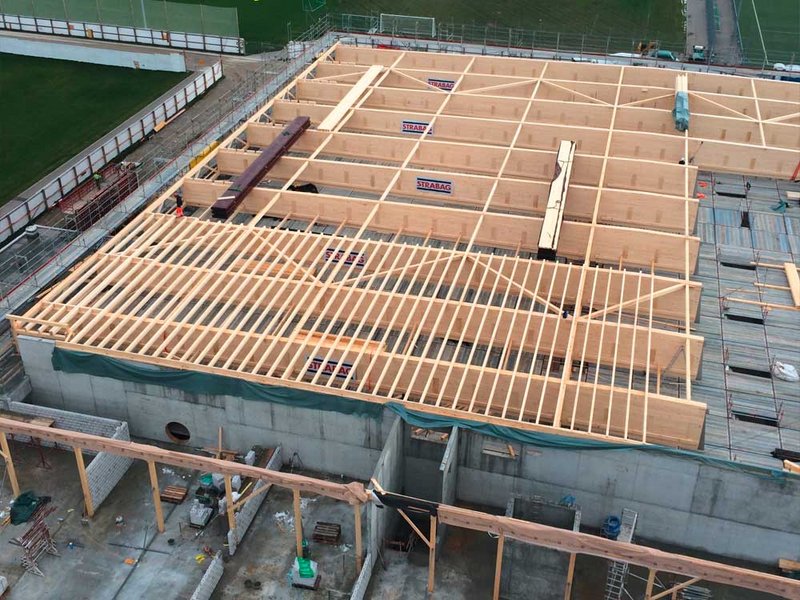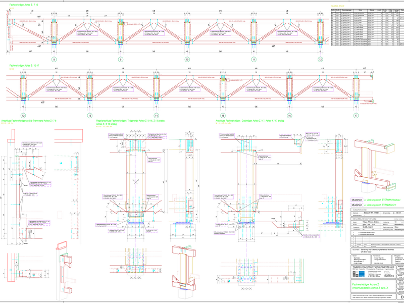 In den rund acht Monaten von Auftragseingang bis Baubeginn waren bei Strabag Holzbau zeitweise drei Mitarbeiter mit der Werkplanung, Ausführungsstatik und Arbeitsvorbereitung befasst. Drei weitere Mitarbeiter waren ausserdem rund zwei Wochen mit dem Einmessen und der Vormontage der Stahlbauteile beschäftigt. Die Aufrichte des Haupttragwerks mit zwanzig Holzbindern (2,80 respektive 2,72 auf 0,36 Meter) erfolgte dann in nur einer Woche durch sechs Zimmerleute. Für die Montage wurde vorgängig ein vollflächiges Arbeitsgerüst erstellt, was ein sicheres Arbeiten ermöglichte. Neben dem Primär- und Sekundärtragwerk in Holz wurden auch die Flachdachelemente, die Aussenwände, der Technikanbau, der Anbau für die Anlieferung und die Brandschutzverkleidungen durch Strabag Holzbau montiert. Hierfür waren weitere vier Mitarbeiter während drei Monaten im Einsatz, die 156 m3 OSB-3-Platten, gut 800 m3 Brettschichtholz, knapp 180 m3 Konstruktionsholz sowie 6?m3 Sperrholzplatten, 3?m3 Furnierschichtholz und 2 m3 Brettsperrholz für das Hallenbad verbauten. Allein für die Anlieferung der Hauptträger waren zehn Spezialtransporte erforderlich.