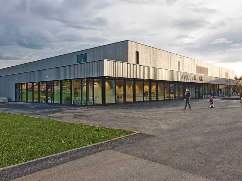Der hohe Holzanteil in der Tragwerkskonstruktion, das kompakte Volumen sowie die neue Gebäudehülle wirken sich positiv auf die Nachhaltigkeit des Hallenbads aus, das im Minergie-Plus-Standard realisiert wurde. Unter anderem wurden zusätzliche Dämmungen und Sonnenkollektoren für die Warmwassererzeugung eingesetzt. Die Badewassertechnik ist im Untergeschoss des Gebäudes angesiedelt. Die übrige Haustechnik wurde jedoch aufgrund des hohen Grundwasserspiegels in einem Vorbau angeordnet, was sehr direkte Leitungsführungen zu den verschiedenen Gebäudebereichen ermöglicht. Eine Photovoltaikanlage auf dem Hallenbaddach generiert Strom. Er wird über eine Trafostation in die Hauptverteilung des Sportareals eingespeist. Weitere Sonnenkollektoren wärmen das Bade- und das Brauchwasser vor. Eine Öl-/Gasheizung ist mit einer Wärmerückgewinnungsanlage aus Abwasser kombiniert, die die Wärme des gesamten Hallenbadabwassers nutzt. Auch verbrauchtes Badewasser wird nicht einfach entsorgt, sondern aufbereitet und zur Flächenreinigung der Anlage sowie als WC-Spülwasser genutzt.