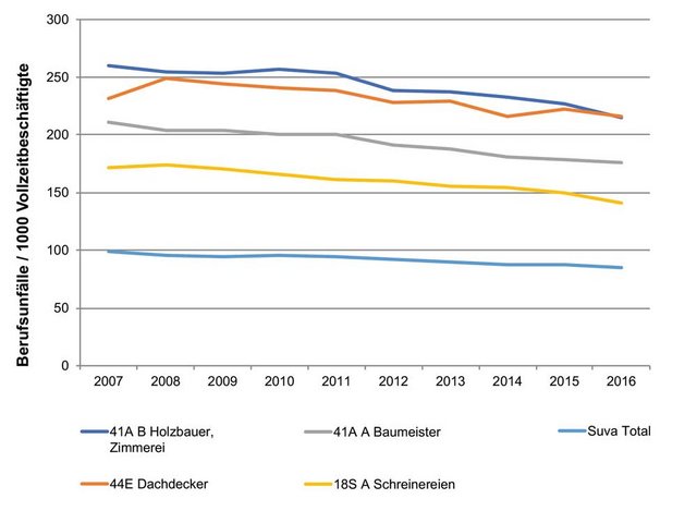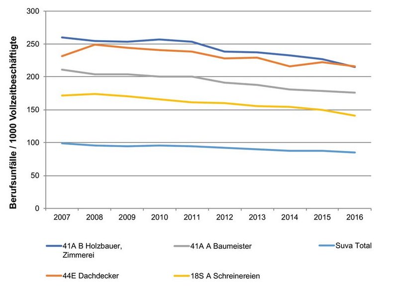 In Holzbaubetrieben ereigneten sich im letzten Jahr 3505 Berufsunfälle. Das sind 160 weniger als 2015. Damit sank das Berufsunfallrisiko auf 215 Unfälle pro 1000 Vollbeschäftigte und die Suva-Basisprämienansätze in der Klasse 41A B0 bleiben dank dieser Verbesserung unverändert.