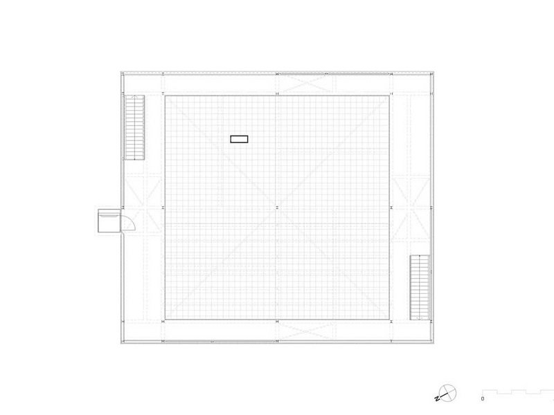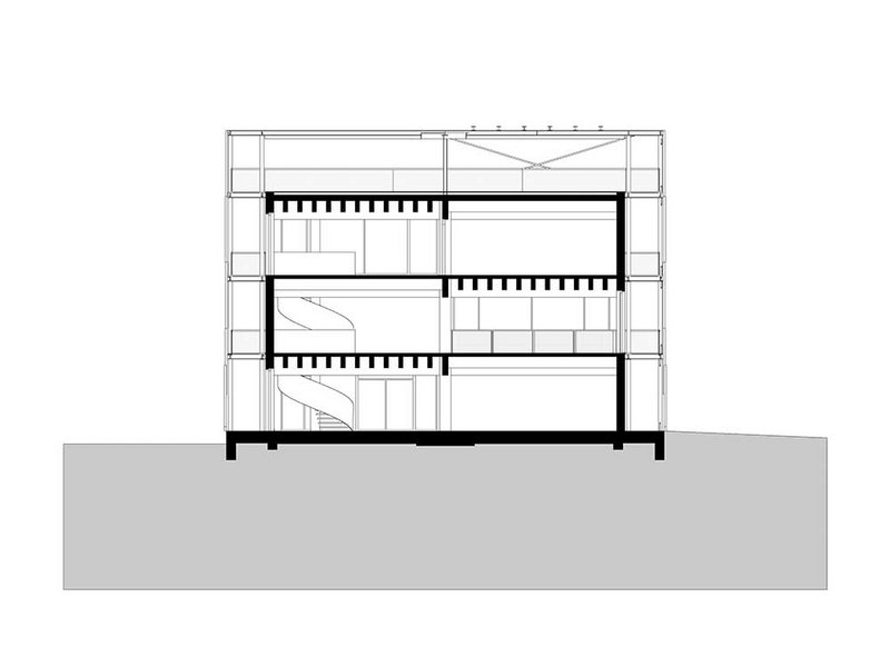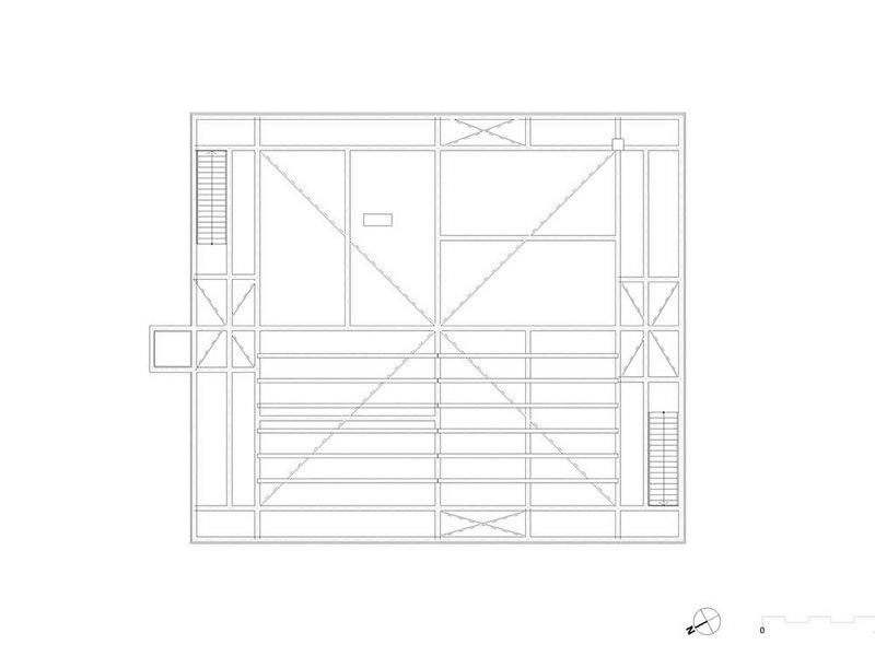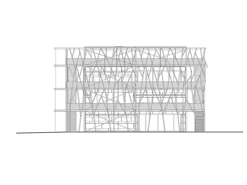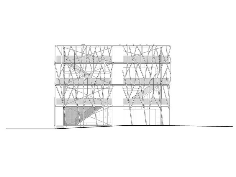 Eine zentrale Rolle spielen die 60 Jahre alten Hochspannungs-Gittermasten, die dem Netzbetreiber Swissgrid als Schrottmaterial abgekauft wurden. Anstatt eingeschmolzen zu werden, ummanteln sie jetzt die Laubengänge, die eine ebenfalls stählerne Gitterstruktur rund um den hölzernen Kubus bilden. Ursprünglich sollten die gebrauchten Masten tragend eingesetzt werden, doch da die aussenliegenden Gänge auch als Fluchtweg dienen, liessen die Baubestimmungen dies nicht zu. So bilden die ehemaligen Strommasten jetzt ein Rankgerüst für Kletterpflanzen, was wiederum der Verschattung und damit dem (Raum-)Klima dient. Zudem sind die Laubengänge eine nicht zu beheizende Erschliessungszone, sodass das Innenvolumen reduziert werden konnte. Das Masten-Motiv wiederholt sich im Innenraum an den Brüstungen.