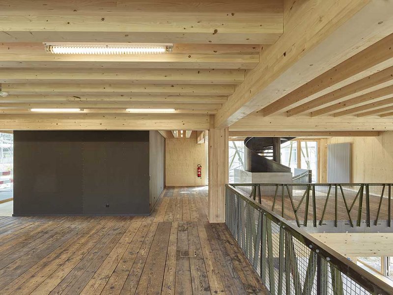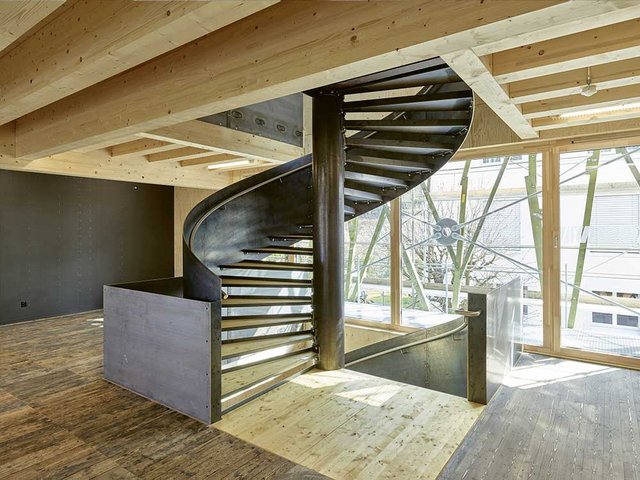 Die Konstruktion des roh belassenen und unverkleideten Massivholzes aus der Region ist im Innern sichtbar. Im zweigeschossigen Luftraum ragt eine Spindeltreppe aus Stahl empor. Für den Treppenbelag wurde das Holz wiederverwendet, das von der eigenen provisorischen Bautreppe übriggeblieben war. Die Holzdielen in den Obergeschossen stammen zur Hälfte von einem Bootshaus, das 1911 in Kaiseraugst (AG) gebaut worden war. Andere alte Bauteile im Innenausbau kommen aus der Bauteilbörse im Basler Stadtteil Klybeck, darunter eine komplette Küche. Alle Nasszellen sind fast ausschliesslich mit ausrangierten Elementen eingerichtet, zum Beispiel die Waschbecken, Trennwände und Armaturen. Die gefliesten Oberflächen stammen aus Restposten beziehungsweise aus aussortierten Produktionen. Das gesamte Beleuchtungskonzept basiert auf Leuchten aus Abrissobjekten, die teilweise repariert und mit modernen LED-Leuchtmitteln bestückt wurden. Auch bei der Fassadenverkleidung des Holzbaus konnte auf Restmaterial einer anderen Baustelle, einer grossen Wohnsiedlung im Raum Luzern, zurückgegriffen werden. Der günstige Verschnitt aus Kompaktlaminat bestand aus unterschiedlich kleinen Teilen, was einen Mehraufwand bei der Planung und Montage sowie ästhetische Kompromisse erforderte.