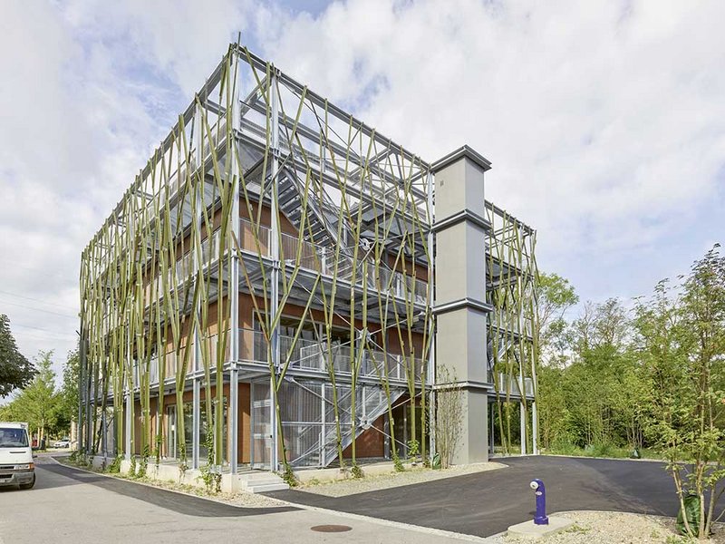 Das dreigeschossige Hauptvolumen ist als reiner Holz-Skelettbau realisiert – mit grossen Spannweiten von gut sieben Metern. Das Fundament besteht aus einer Betonplatte mit Frostschürzen und Pfählen. Die Holzstruktur, errichtet von der Stamm Bau AG aus Arlesheim (BL), basiert auf einem quadratischen Grundriss von rund 15 auf 15 Metern, der in vier Quadranten geteilt ist. Alle Decken sind auf einem Trägersystem aufgebaut, das von einem mittleren Pfeiler aus Baubuche getragen wird. Die komplette Balkenstruktur der Decken ist sichtbar. Die Aussenwände bilden einen Teil der tragenden Struktur. Um möglichst viel Energie sparen zu können, liegen alle notwendigen Verkehrswege (Fluchttreppen, Gänge und Lift) ausserhalb des Dämmperimeters. Durch die Laubengänge, welche die Konstruktion festlegen, ist das Gebäude in klar getrennte Nutzungsbereiche aufgeteilt. Der kompakte Baukörper ermöglicht eine kleinere Energiebezugsfläche. So liessen sich Kosten reduzieren.