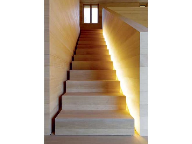 Lediglich ein schmaler Wirtschaftsweg – zunächst noch asphaltiert, aber bald nur geschottert – führt von Gais (AR) aufs Stössi. Kurz bevor sich der Pfad scheinbar im Himmel verliert, tatsächlich aber nach der Kuppe in der Wiese endet, erhebt sich das Heidenhaus von Bauherr Guido Koller. Der Garagenplatz am Wegesrand bietet noch eine letzte Möglichkeit, das Auto zu parkieren. Dann erfolgt der kurze Anstieg zum Haus. Der langgezogene Holzbau erstreckt sich über 25 Meter in west-östliche Richtung. Zunächst fällt der Blick bei der Ankunft auf den Stallteil mit seiner acht Meter breiten, vertikal verbretterten Westfassade. Davor lädt ein kleiner Sitzplatz ein, die Abendsonne zu geniessen. Nur bei genauem Hinsehen ist hinter der luftigen Lattung im leicht zurückgesetzten Obergeschoss der vollverglaste Giebel zu erkennen. Auf der Längsseite des Hauses, gerade dort, wo der Stallteil mit der vertikalen Holzverbretterung endet und der Wohntrakt mit seiner Holzschindelfassade beginnt, befindet sich der Eingang. Von zwei Seiten führt mit je acht Stufen ein eigens für dieses Haus entworfenes Treppenbauwerk zur Haustür. Die Eleganz und Präzision der Treppenanlage mit ihrem filigranen Edelstahlgeländer und den auf Gehrung geschnittenen Leisten über einem unsichtbaren Betonkern lässt – wie das Panoramafenster neben der Haustür – schon erahnen, dass sich das Haus auch in seinem Inneren aussergewöhnlich präsentiert.