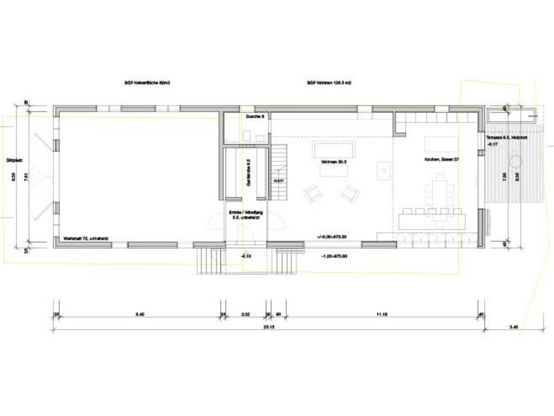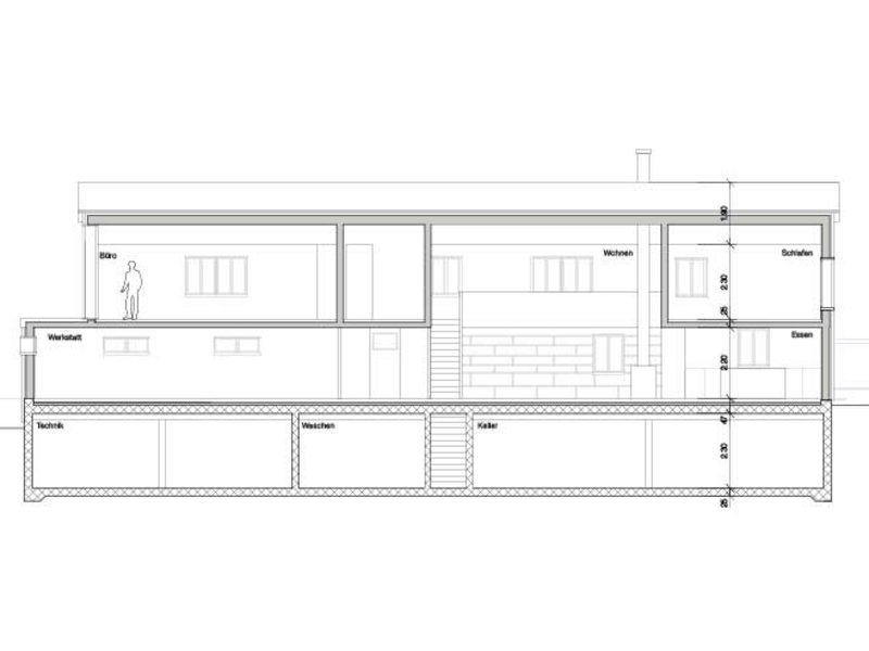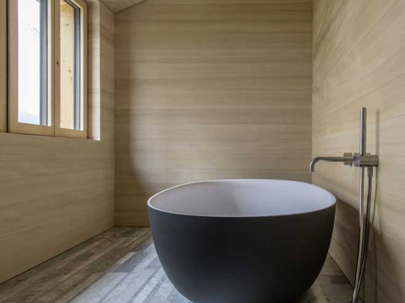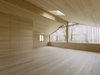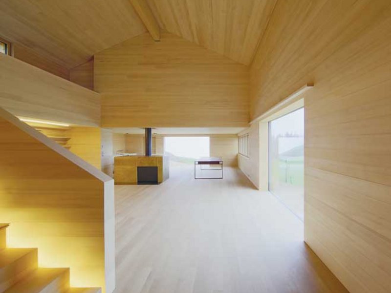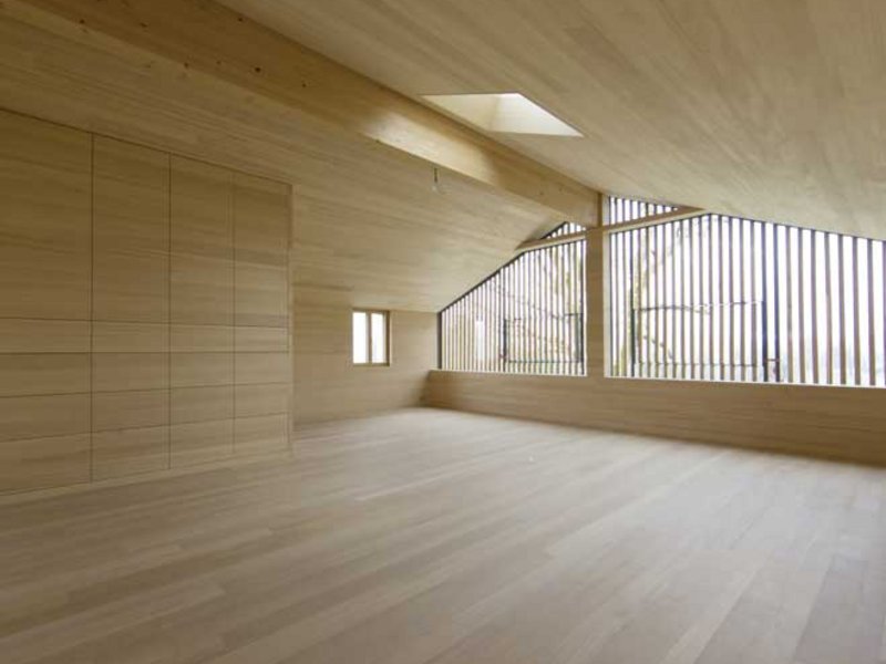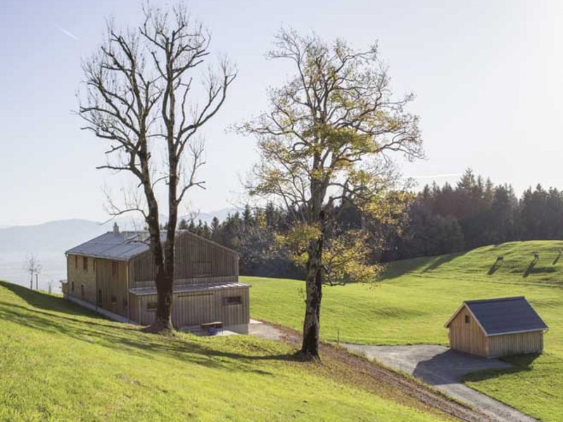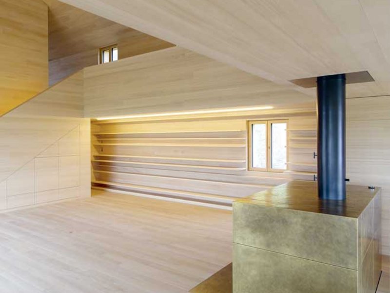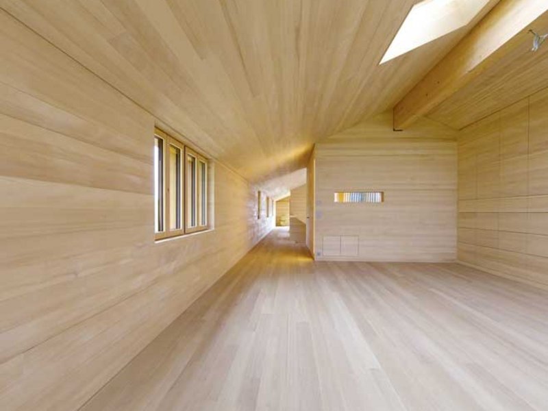 Wenn sich die Haustür öffnet, ist dem Bauherrn die Überraschung seiner Gäste sicher. Was sich offenbart, ist alles andere als das typisch kleinteilige Innenleben eines Bauernhauses. In seinem Wohnhaus gibt es weder ein Entrée, noch ein separates Treppenhaus. Keine Trennwände und Zwischendecken, die das grosszügige Raumgefühl stören würden. Stattdessen verbirgt sich hinter der traditionellen Schindelfassade ein Bijou mit Loftcharakter. Ein einziger grosszügiger Raum, der zum Wohnen, Kochen und Essen genutzt wird, öffnet sich teils bis unter den Firstbalken. Die Treppe führt offen auf die Galerie im Dachgeschoss. Von dort werden das Büro und das Bad über der Werkstatt im Stalltrakt erschlossen, wie auch auf der anderen Hausseite der Schlafraum, der lediglich Küche und Essplatz überdeckt. Im Erdgeschoss versteckt sich hinter der Treppe ausserdem noch ein kleines Gästebad. Das Innere des Hauses besteht wie die Konstruktion und die Aussenhaut durch und durch aus Holz. Doch während aussen unbehandeltes Lärchenholz der Witterung trotzt, hat der Bauherr für das Innenkleid astreine, unbehandelte Weisstanne gewählt. Die Böden sind mit massiven, sägerohen Eichenholzdielen belegt, die geschliffen und geölt wurden. Lediglich das Untergeschoss des Gebäudes ist betoniert. Zugänglich ist der Kaltkeller, der sich unter dem gesamten Gebäude erstreckt, über eine Treppe unter einer Bodenklappe im Stalltrakt. Genutzt wird er für gelegentliche Ausstellungen, die der kunstinteressierte Bauherr organisiert.